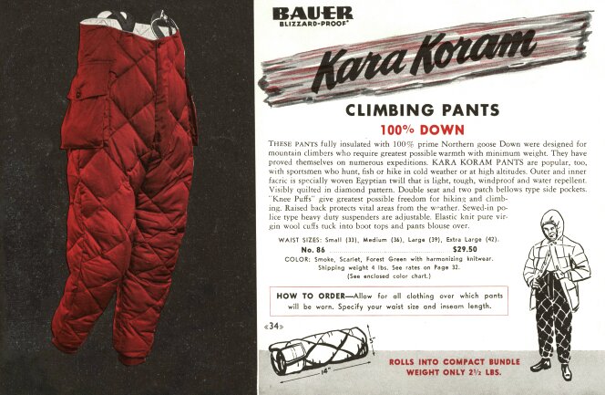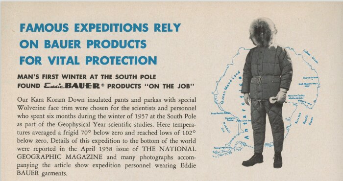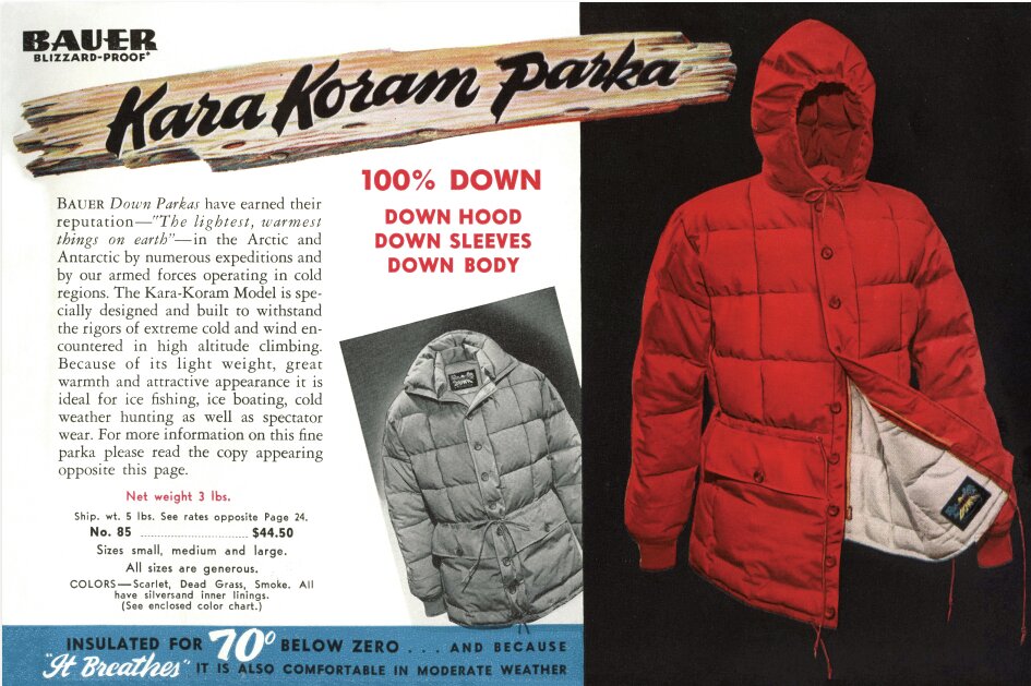 第二次世界大戦で数多くのフライトダウンスーツやスリーピングバッグを提供したブランドの規模は格段に成長し、次のフェーズを迎えていた。1952年秋、あるアメリカの登山家チームは世界第2位の高峰であるK2の初登頂を計画し、その際の寒冷地用高所装備品をエディ・バウアーに依頼したのだ。