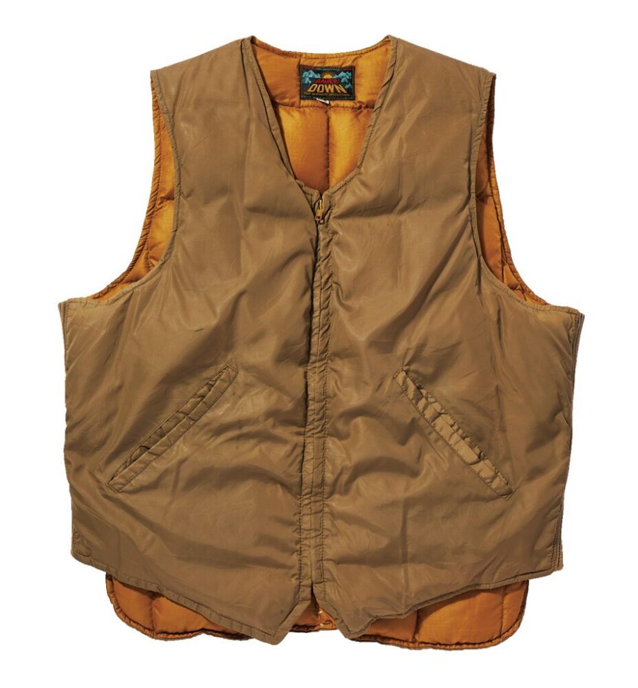 脇下がニットリブになったダウンベスト。当初は、フロント左右のポケット口が水平で、1960年に入るころにはハの字になる。つまり写真は60年代製。2万7390円(バックストリートTEL042-720-0355)