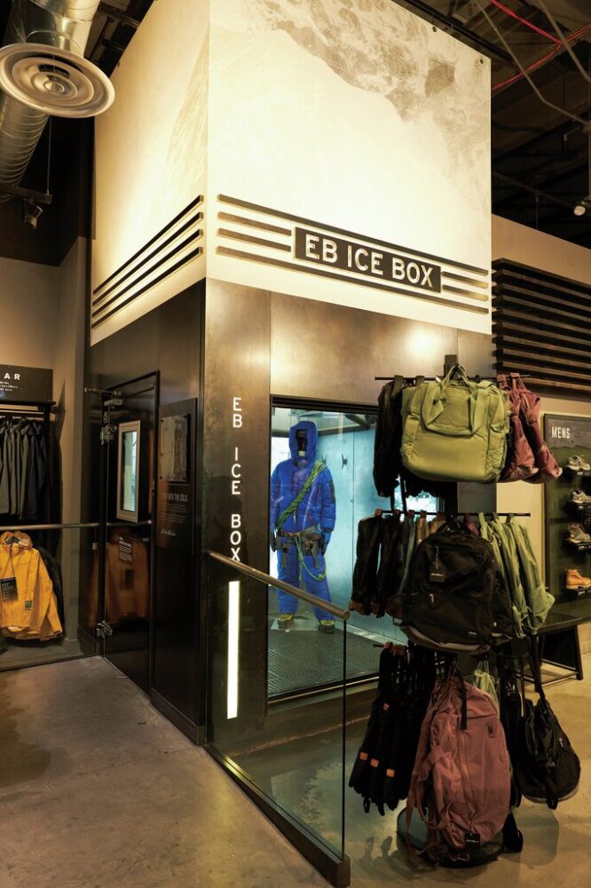 とりわけ、店内奥に鎮座する「EB ICE BOX」は訪れた多くのカスタマーを魅了する。ダウンジャケットの性能を確かめるだけでなく、ブランドの歴史も知ることができるインスタレーションは、限られた店舗にしかないので現地を訪れたら是非体験してほしい。