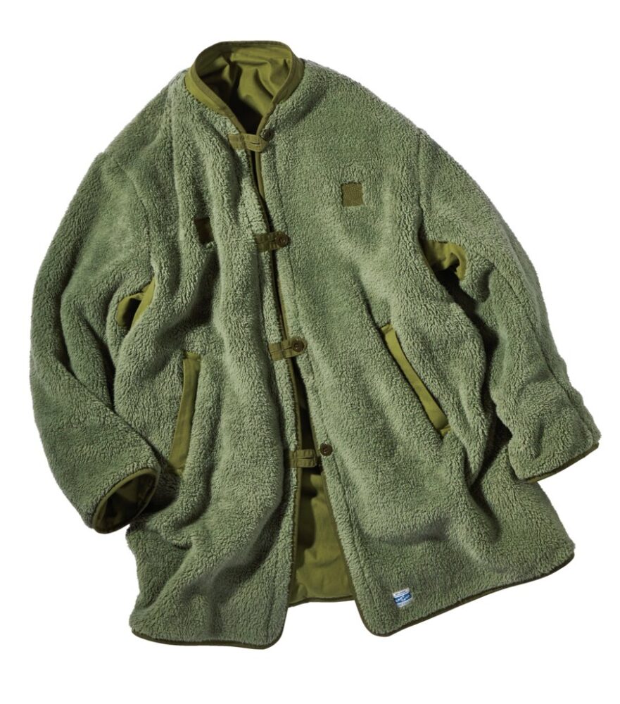 武骨なオリーブカラーながらも柔らかい雰囲気を纏うこのコートは、フリースとブロークンツイルのリバーシブル仕様。ブロークンツイルは通常のツイルの変形組織で、滑らかでかつツイルのデメリットであるよじれが出にくいのが特徴。