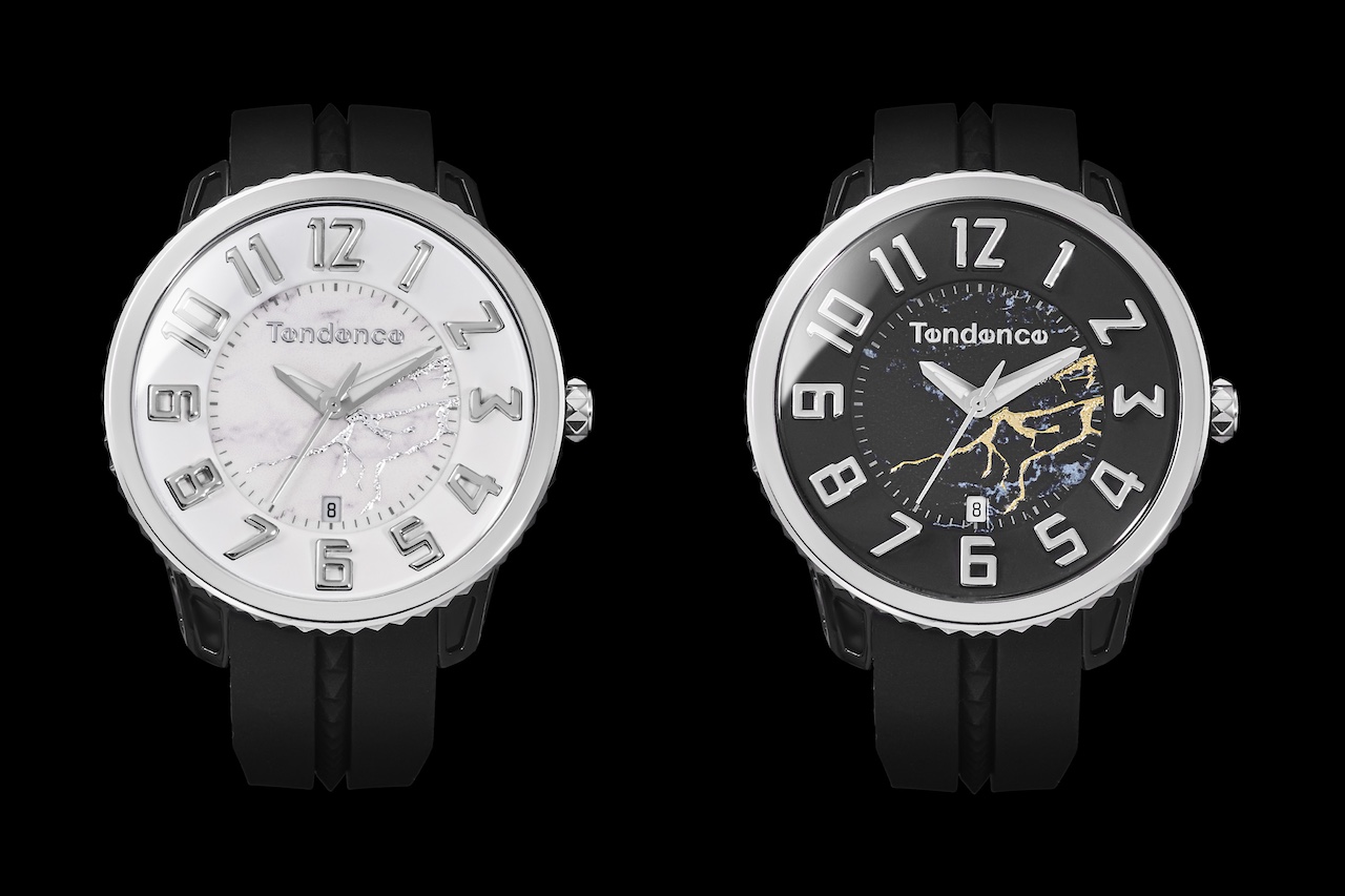 テンデンスのラインナップの中ではコンパクトな41mmサイズのコレクション「GULLIVER Round 41mm」をベースに誕生した本モデルは、文字盤中央に高級感とエレガンスな印象を与える大理石風のマーブル模様がデザインされている。