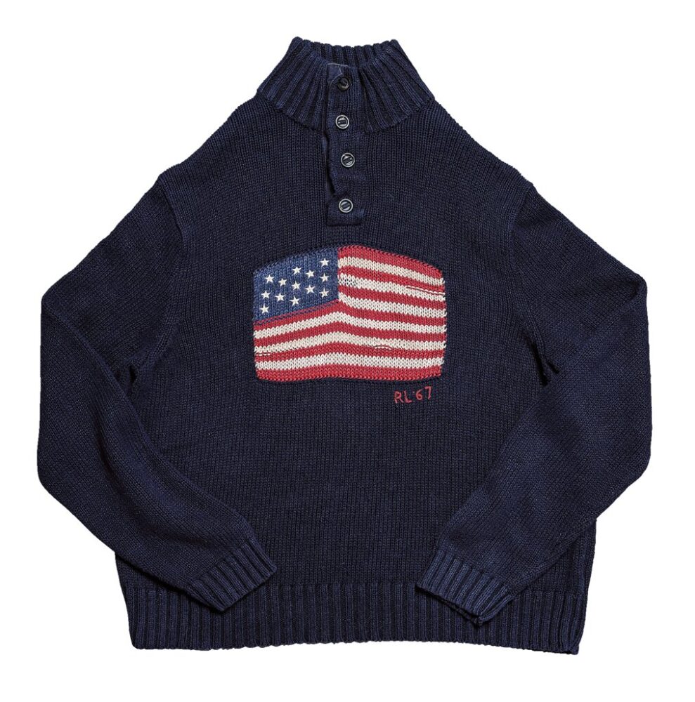 アイコニックな星条旗の刺繍が入った厚手のコットンニット。首元のボタンを閉めてタートルネックのように着てもよし、ボタンを開けて中にBDシャツなどを着てレイヤードを楽しむのもよしな万能アイテム。18,920円