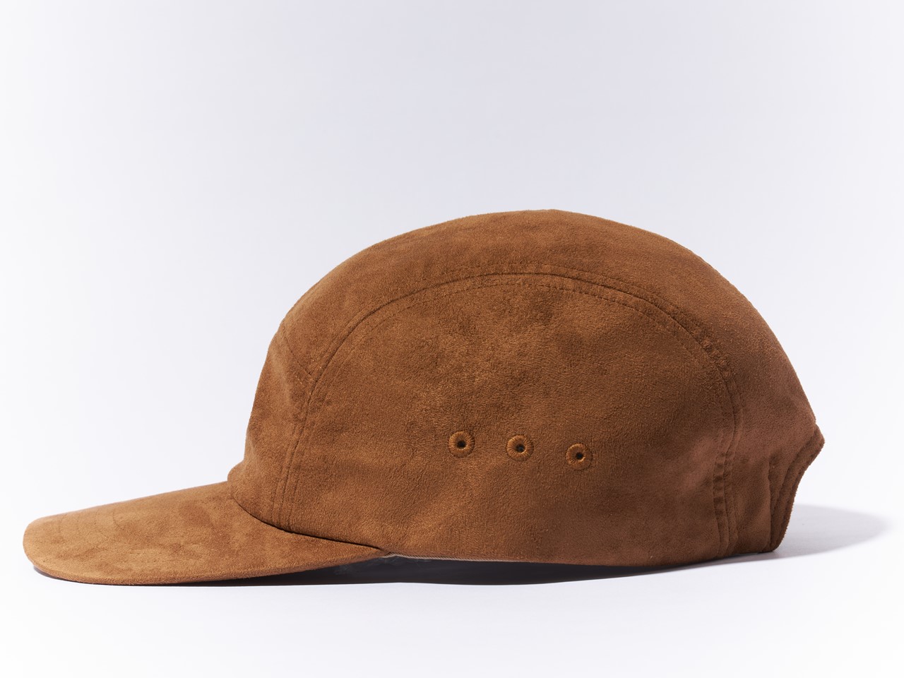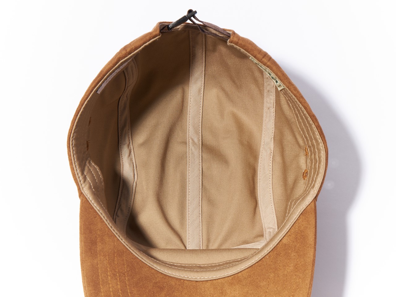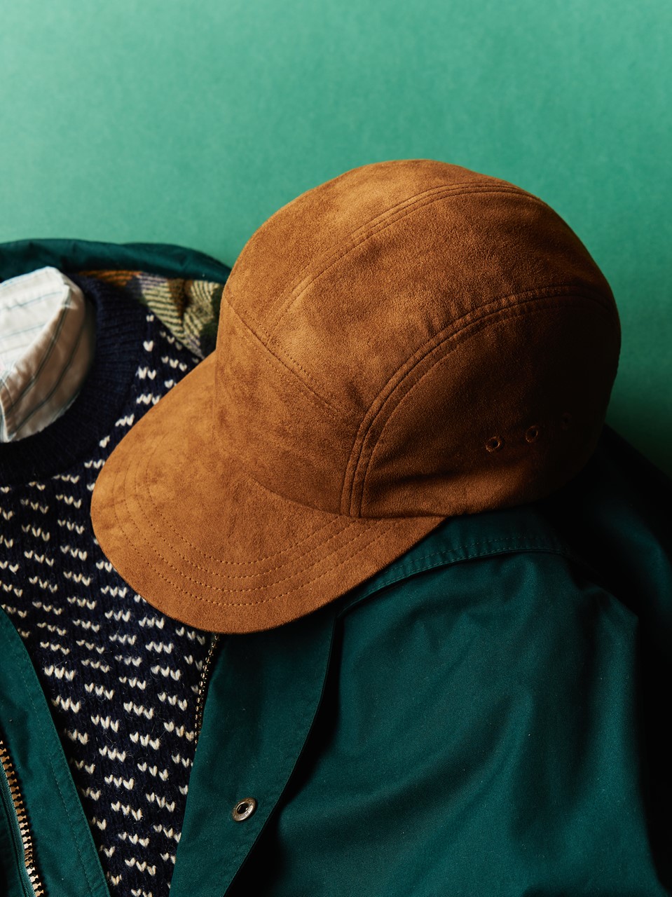 US古着でたまに見かけるスウェードやピッグスキンのキャップってカッコいい。帽子は本来日除けや雨対策のアイテムでもあるのに、水濡れに弱いレザー素材を組み合わせるという、そもそも本末転倒なデザインがむしろ古着好きの心をグッとつかむ。そこで本別注ではフェイクスウェードの生地を用いて、手洗い可能なスウェード調キャップを作ってしまおうという発想のもと、企画がスタート。ヴィンテージキャップに範を取り、5パネルとも言われる「ジェットキャップ」のスタイルを採用しようとしたところ、難題が持ち上がった……。