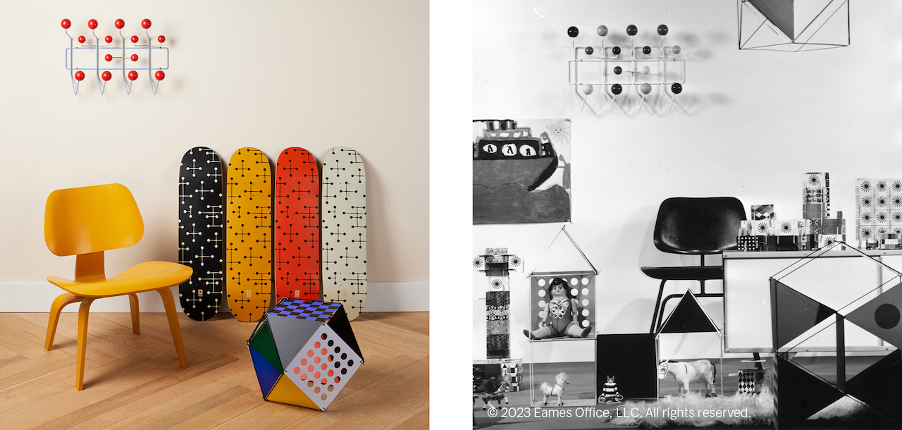 Pop-Upイベントでは、最も有名なモチーフであるドット・パターンが再現されたスケートボードの新作やキッズ向けのデザインなど、イームズ・デザインを象徴するアイテムが揃う。