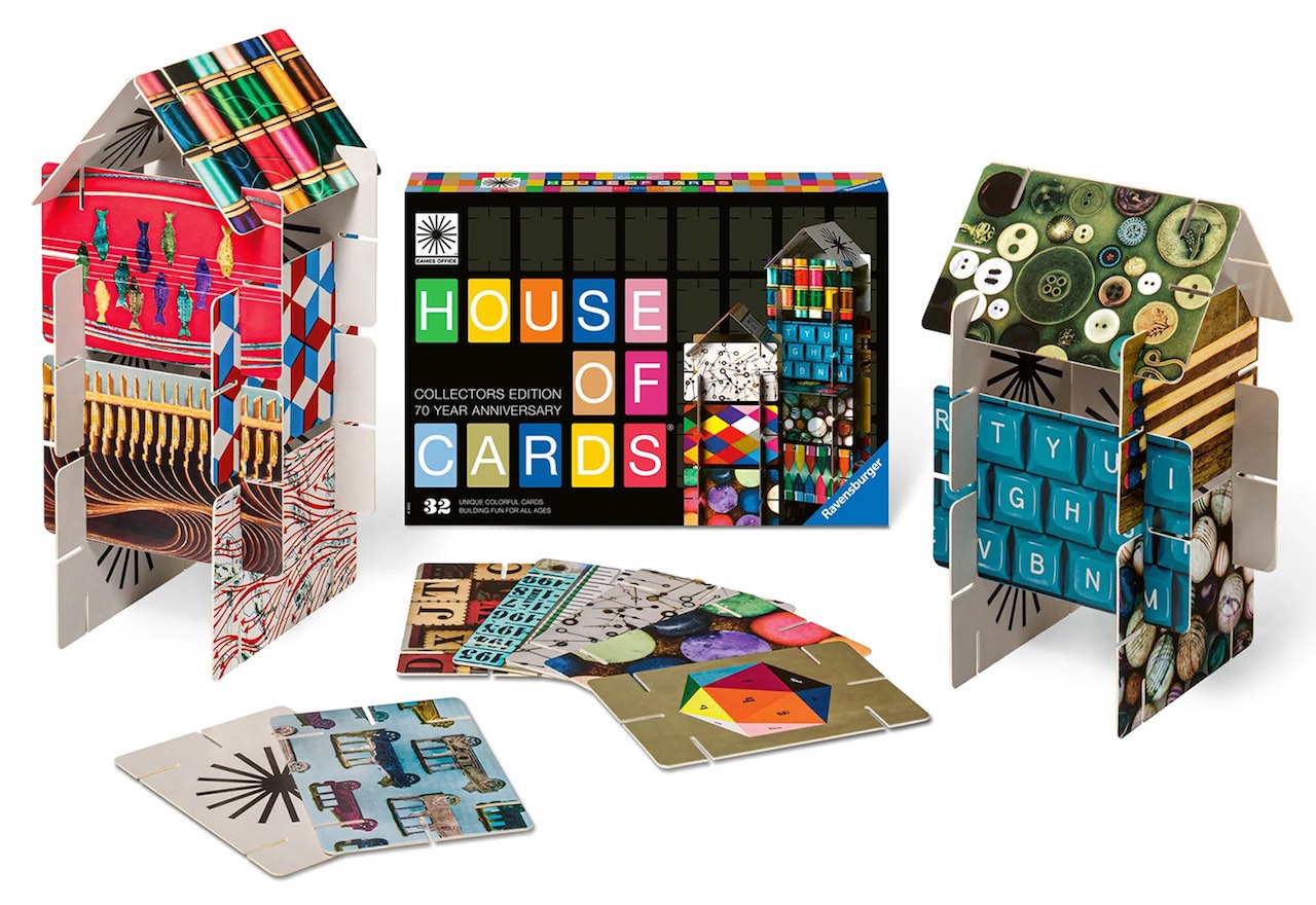 多くのイームズ作品と同様、デザイン愛好家に人気のコレクターズアイテム。 各カードには、無数の楽しいデザインと写真を含む32枚のカードが入っており、オリジナルの「スモール ハウスオブカード」のパターンと絵、「ジャイアント ハウスオブカード」の大胆なグラフィック、1970年代の「コンピューター ハウスオブカード」の貴重な写真が、このコレクターズエディションで1つになった。各カードには6つの切り込みがあり、自由に立体を組み立てて遊ぶことができる。