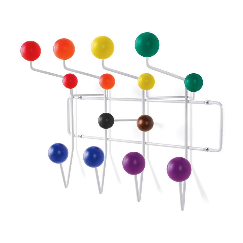 1953年に登場したイームズ ハング・イット・オールは、チャールズ&レイ・イームズの「享楽(きょうらく)について真面目に考える」という信念を具現化した作品。オリジナルはホワイトワイヤーのフレームにマルチカラーのボールが付いているデザインだが、洗練された遊び心のあるデザインはそのままに、素材やカラーのバリエーションを拡大している。