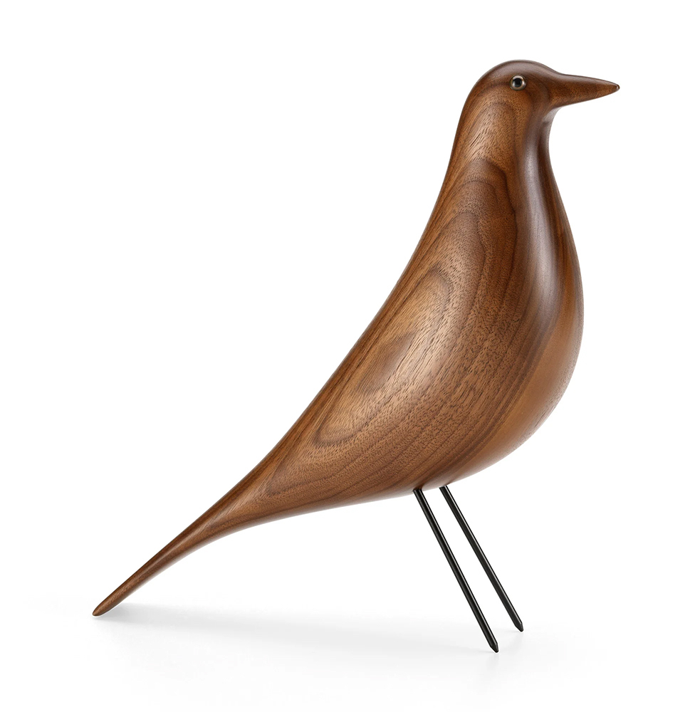 イームズハウスバードは、50年以上にわたってイームズ・ハウスのリビングに佇んでいた黒い鳥のオブジェがベースになっている。イームズ・オフィスと共同で、Vitra社は透明ラッカー仕上げのダークウォルナット材のイームズハウスバードを発表した。素朴な魅力と洗練されたモダニズムの理想の中間に位置し、イームズ夫妻の影響力のあるデザイン美学を完全に具現化している。