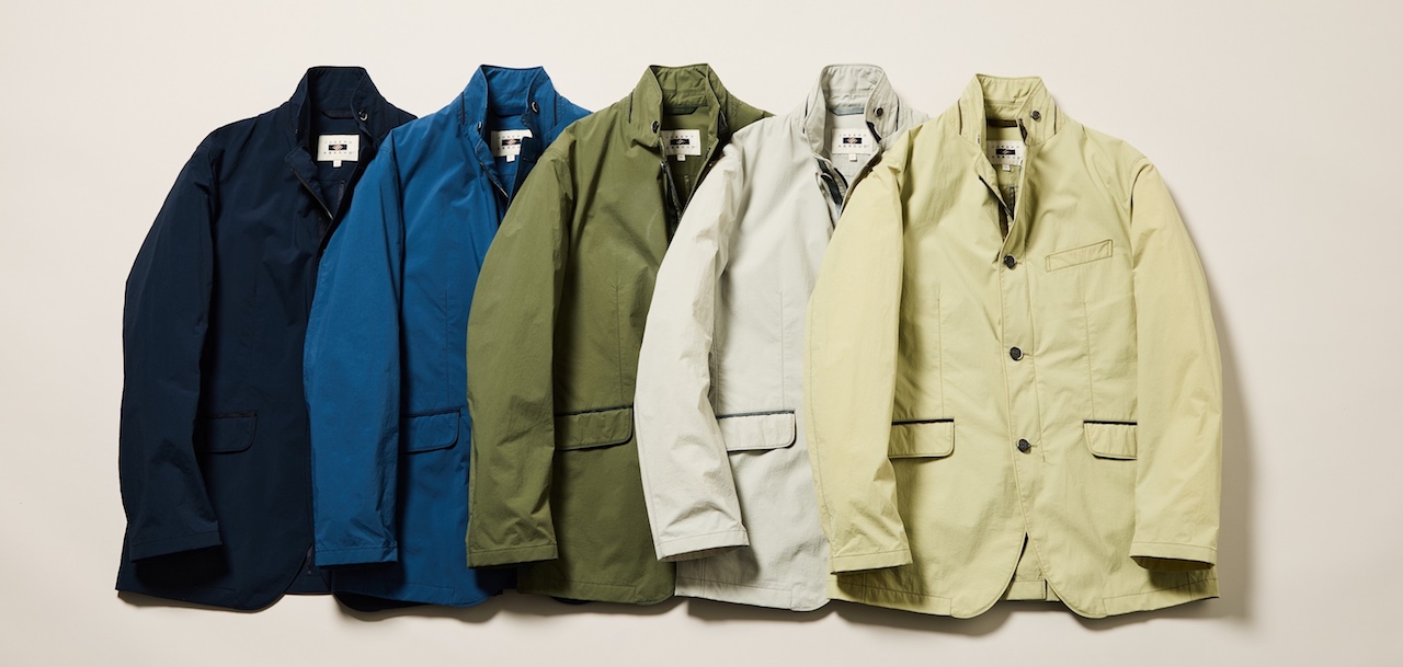 リサイクルナイロンを使ったドライな素材感が特徴のジャケットを、5色のカラーバリエーションで展開。デザインは、コンバーチブルカラーで、後肩にはアクションプリーツを搭載し、裏地にはオリジナルプリント裏地と共に、同素材のギミックチーフもポイントだ。