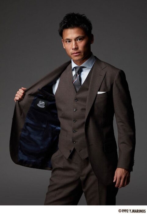 ナチュラルストレッチのウール 100%の生地を採用。肩パットなしのアイコン仕立てでイージーな着心地を実現したオーダーメイド スーツ。ジャケットの内側には、「横浜F・マリノス」のエンブレムが刺繍されたオリジナル織ネーム、トリコロールカラーの衿吊を採用し、ディテールにもこだわった。