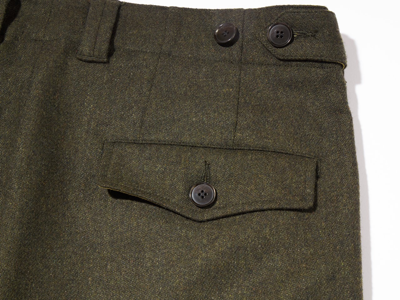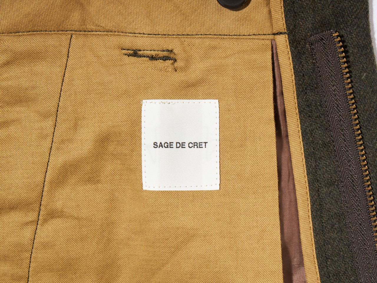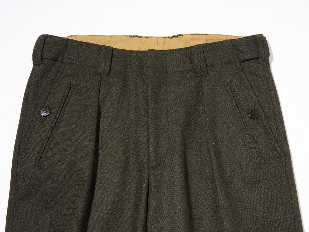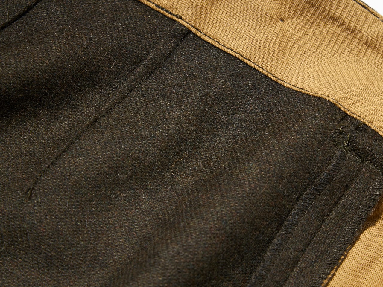 元ネタとなったヴィンテージには、現代には適さない点がチラホラ。まずはウールの生地。本来オーバーパンツだから、あまり関係ないのかもしれないが、素肌の上に着用するとウールの毛羽がチクチクと刺さって、とても落ち着いて穿けたもんじゃない。この問題点こそが、今回の別注アイテム製作に至った一番の要因でもあり、改善されるか懸念していた点だったが、「サージュデクレ」が、非常に穿き心地のよいウール混の生地を探し出してくれた。さらに膝までのライナーつきなので、まず穿き心地は極上です。それでいて、ヴィンテージの重厚な雰囲気を損なっていないというところも非常に高ポイントだ。