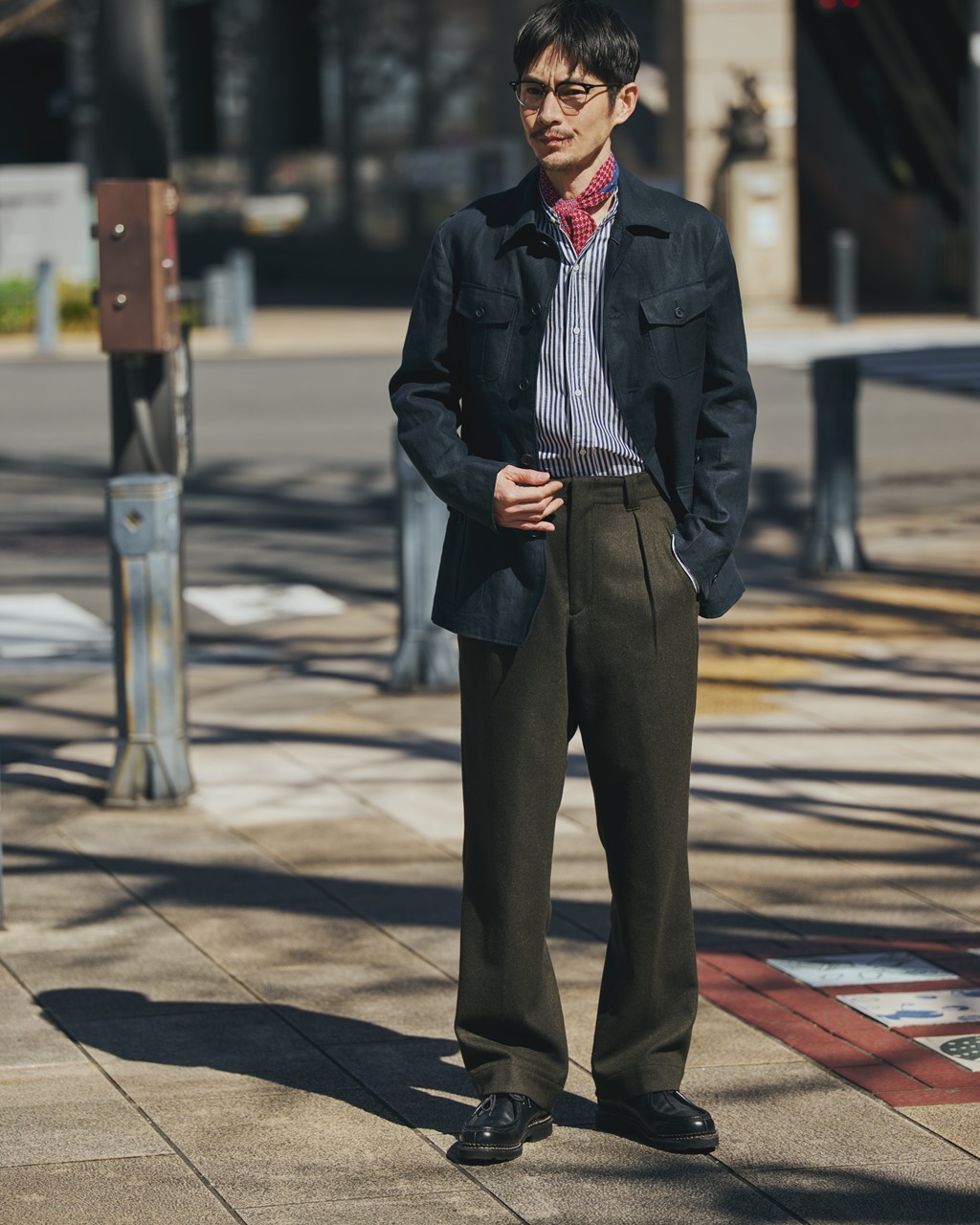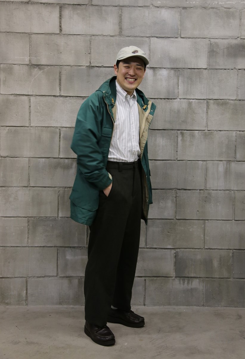 アウトドアアイテムや古着を取り入れたスタイルを好む生田目には、このパンツは合わないかと思いきや、なんの違和感もなくマッチ。元から古着のスラックスを愛用していた彼にとっても、「いい意味で、普段とあまり変わらず穿きやすいです! いつもよりちょっとだけ上品さが増したかな」と太鼓判。