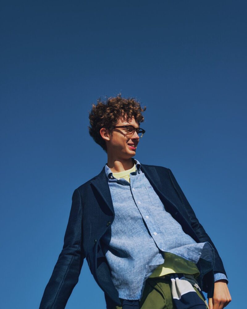 鹿の子素材のようにドライタッチで風通しのいい「カラミ生地」を採用したネイビーブレザーは、とにかく軽やかに着こなしたい。インにはリネンシャツとネオンカラーのTシャツ、仕上げにラグビーシャツを腰に巻けば、東海岸のプレッピーたちも振り返る、サマートラッドな着こなしに。