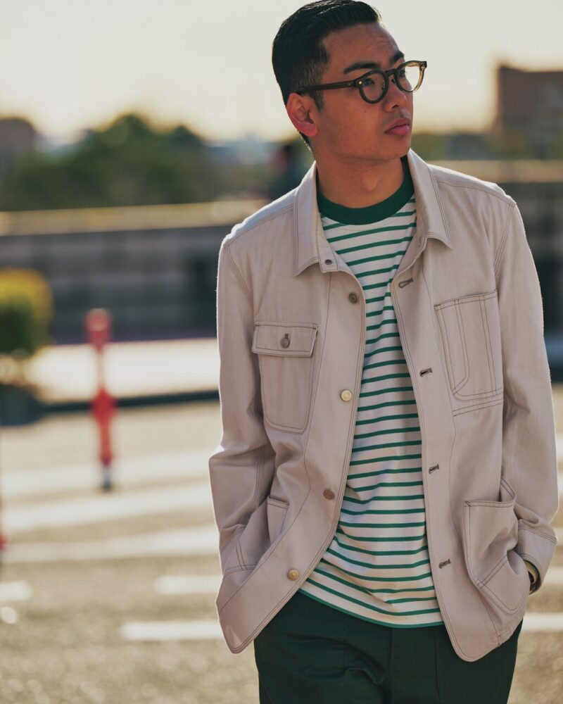 肌馴染みのいいナチュラルなアイボリーカラーのデニムカバーオールは、5.5oz程度のライトオンスで羽織りやすい。挿し色となるグリーンのボーダーが鮮やかな長袖カットソーはプレーティング天竺と呼ばれる綿ポリ素材。表面は綿の自然な風合いながら、裏目はポリエステルで快適。