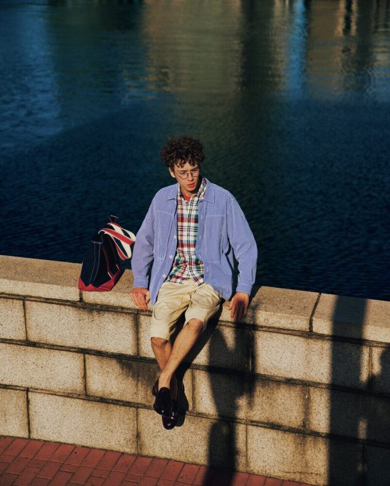 難易度が高い、柄on柄の組み合わせも清涼感のあるヒッコリーストライプとマドラスチェックなら嫌味がない。シャツジャケットはワークテイストな縦長の胸ポケットやスラッシュポケット付きで利便性も十分。膝丈のチノショーツは全体をまとめるスタイリングの万能薬として重宝する。