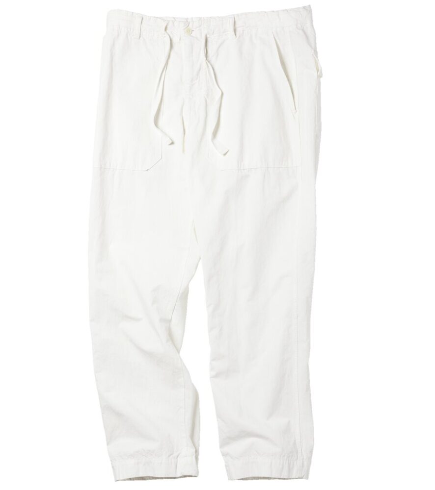 清涼感がありながらも耐久性に優れたブランドの定番素材・コットンヘンプを使用したワイドシルエットのイージーパンツ。製品染めを施すことで上品かつユーズド感のある独特な風合いに仕上げている。ブラックやオリーブの定番色はもちろん、この春は爽やかなホワイトを選ぶことでコーディネイトの幅を広げてみるのも良いのでは? 2万7500円(サージュデクレ03-6452-5188