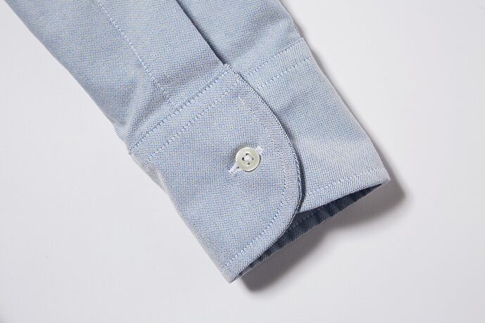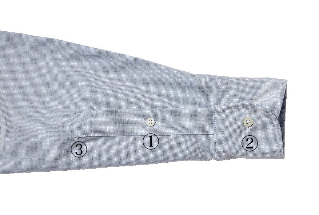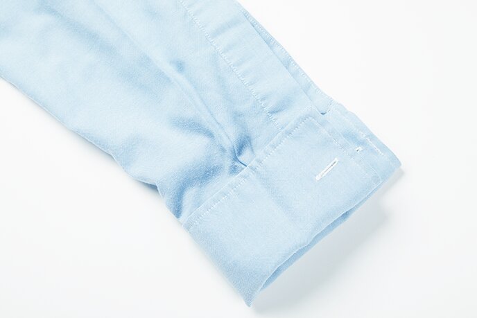 折り返しのない一重仕立てのカフス。カフスに縫い留められたボタンを使って開け閉めを行う。