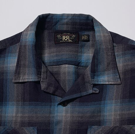 前身頃の合わせの上部が折り返って開いた状態に。夏場に着るシャツに多い意匠。