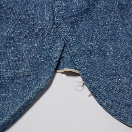 裾の両サイド、フロントとバックの合わせ部分の補強布。ワークシャツでは、ここにおいてミミがアピール。