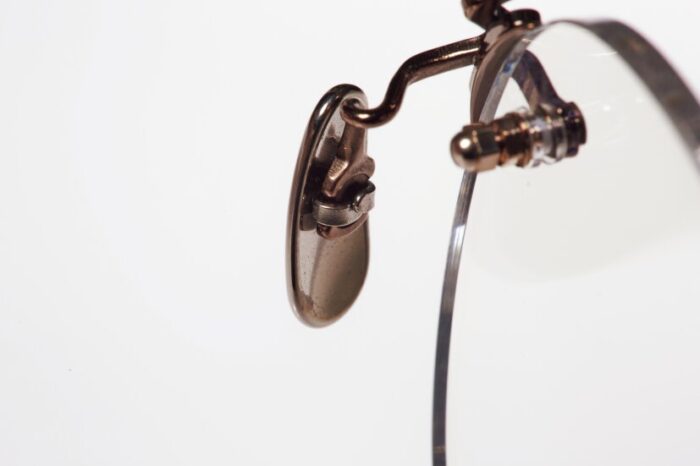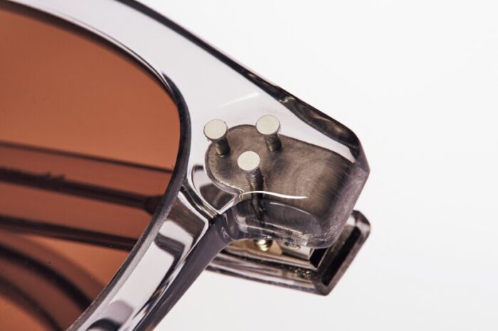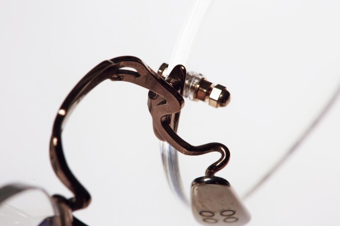 ネジを使わずクリングスとパッドを固定する手法で、飛び出た2本のパーツで、その名の通り抱き抱えるように固定する。高品質なアイウエアの証。