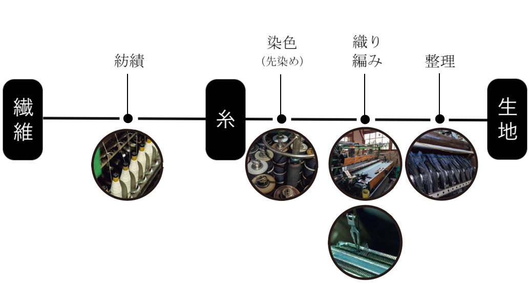 コットンや獣毛などの天然繊維や、ナイロンやアクリルなどの化学繊維。いずれも糸になって、織りや編みといった工程を経て生地になるという流れは基本的には同じ。
