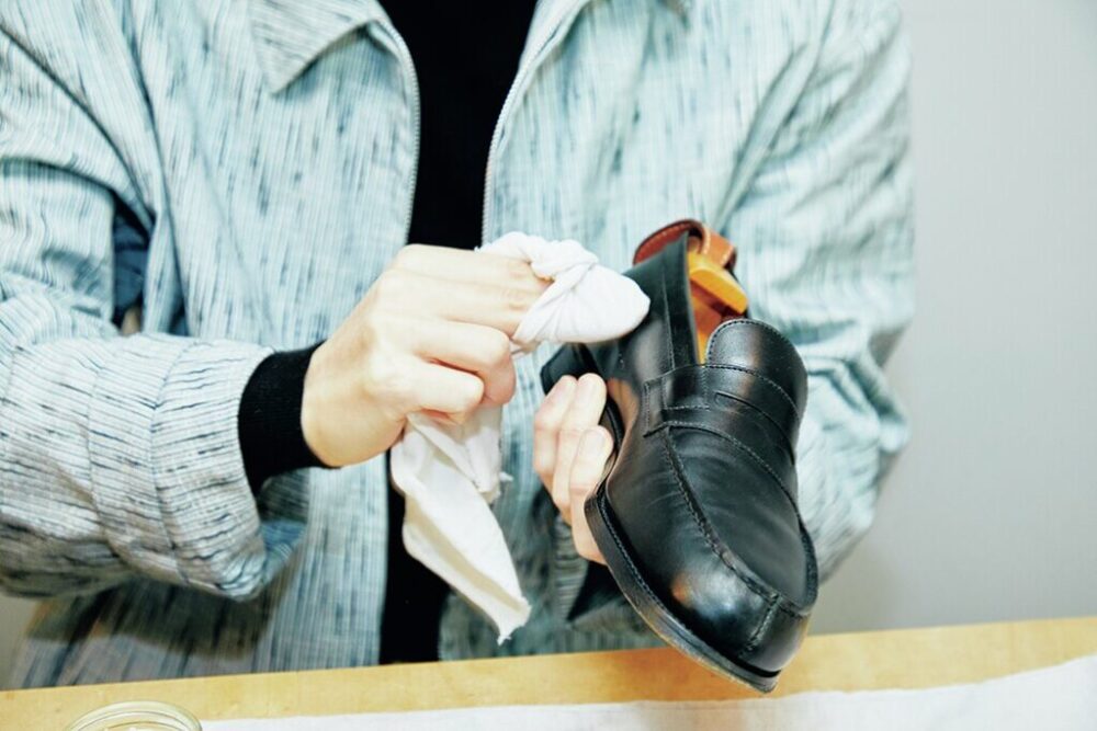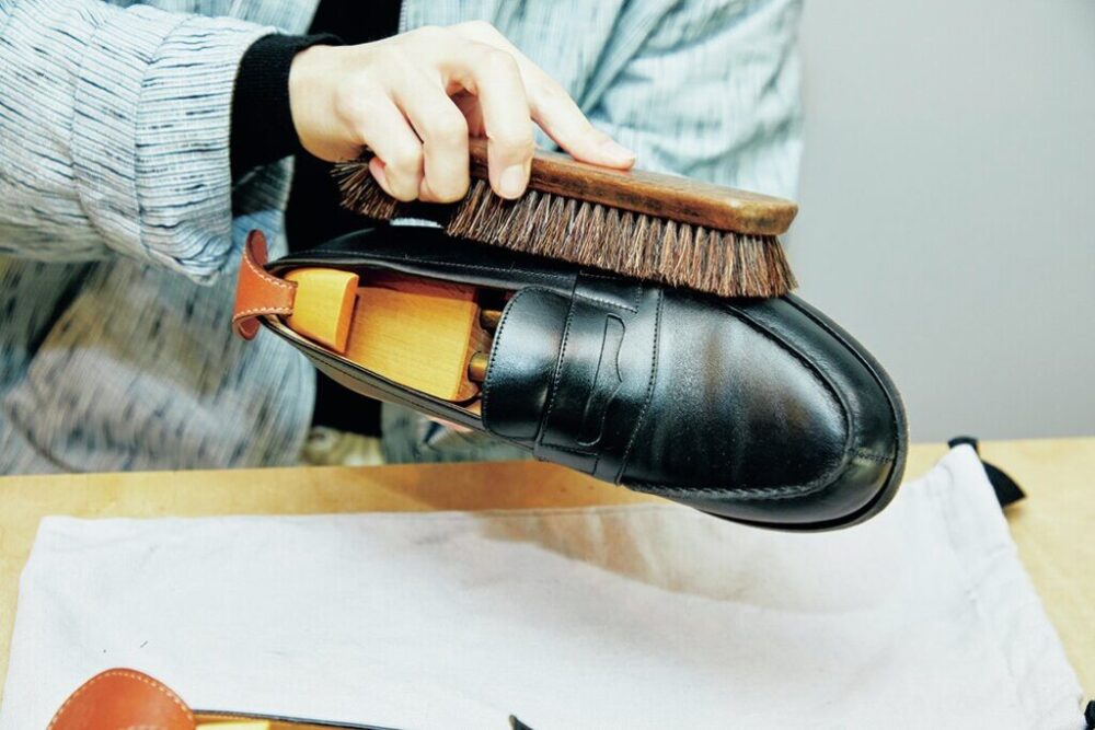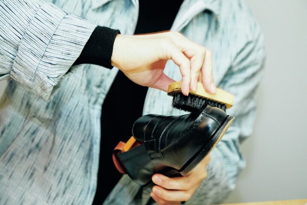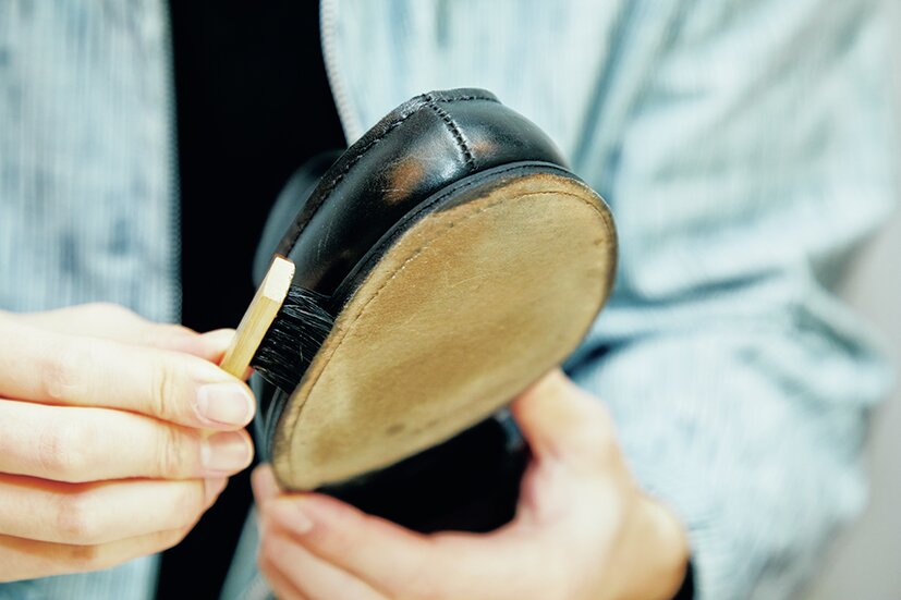 実は意外と大切なブラッシング。クリームを塗る際に間にホコリが挟まってしまうとムラができたり、革に十分な栄養が行き届かなくなってしまうのだ。安武さんは適度な硬さとしなやかさを備える馬毛ブラシを愛用し、時間をかけてゴシゴシとブラッシングする。