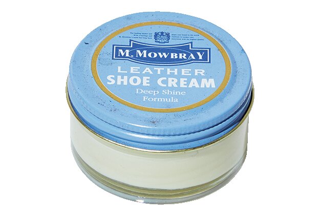 次は革に栄養を与える、靴を長持ちさせるために重要な工程。Tシャツの切れ端を2本の指に巻き付けてクリームを適量取り、全体的に塗っていく。革に必要な栄養である水分・油分の補給の役割を果たす乳化性クリームがおすすめで、ワックスも配合されているため、表面に適度な光沢を出してくれる。1100円(ビームスF TEL03-3470-3946)