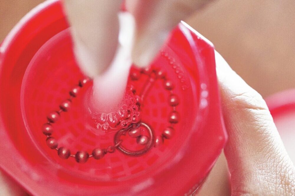 複雑なデザインのものは液体のジュエリークリーナーに浸けて黒ずみを除去