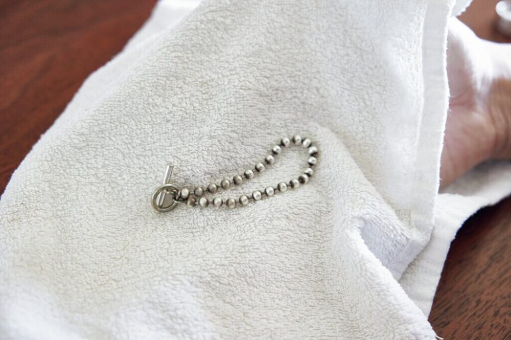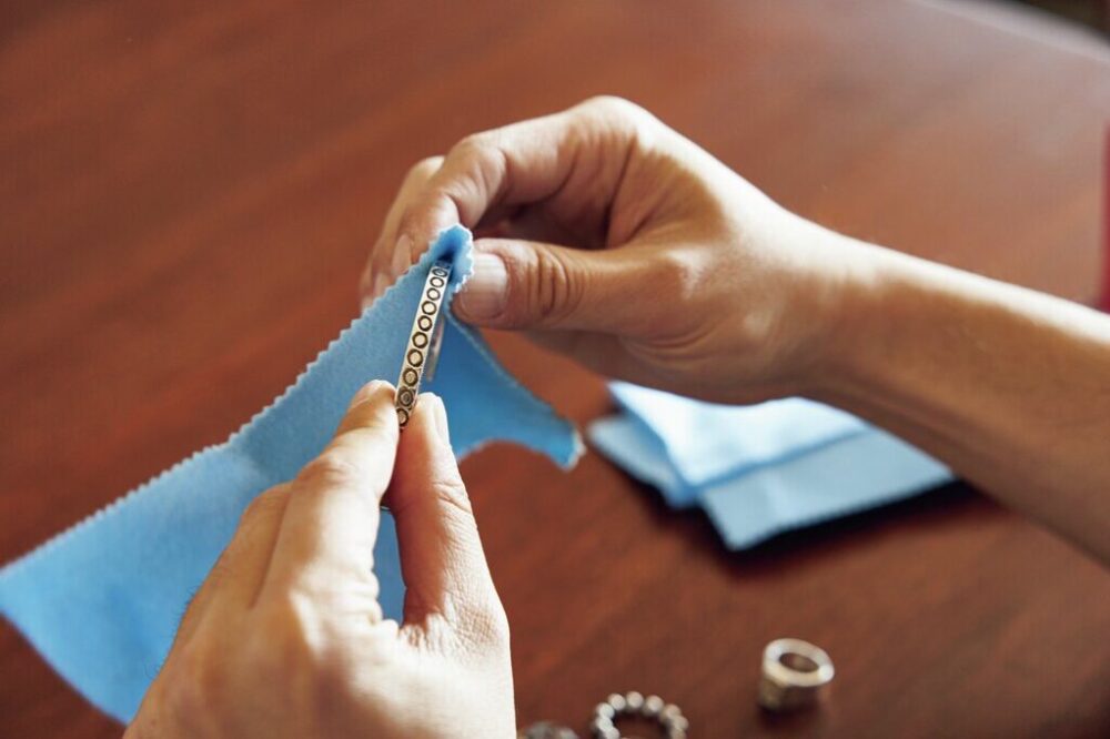 凹凸の少ないシンプルなデザインのものはシルバークロスで磨くのみでOK。注意すべきは「長く放置しないこと」。シルバーが硫化して黒ずんでしまった状態をそのままにしておくと手遅れになってしまう。