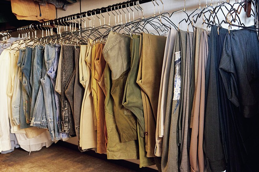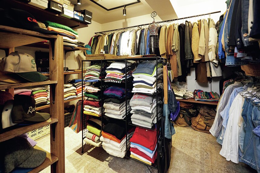 アイテムの配置にもこだわりが。ジャケット、シャツ、パンツなどのアイテムごとにまとめており、その中でもデニム、チノパンなどカテゴリーごとに整理。ショップさながらの雰囲気が漂っている。
