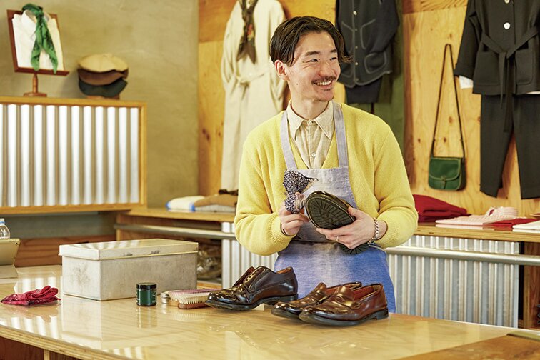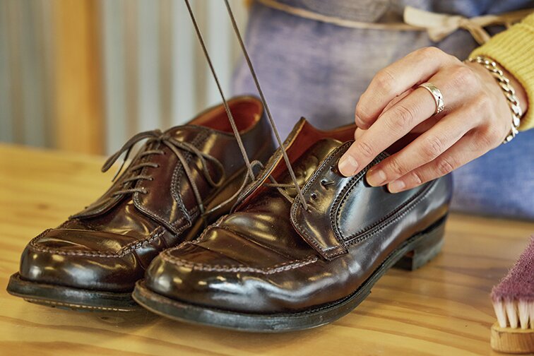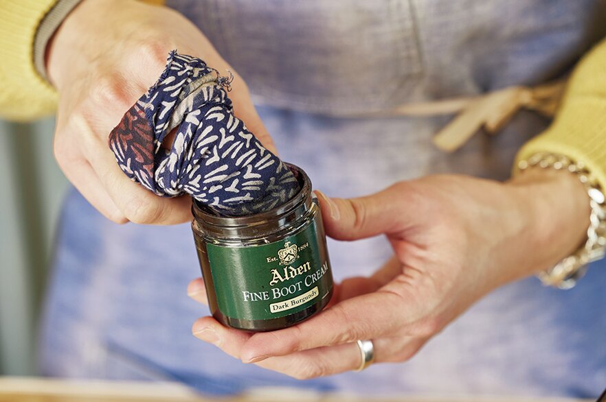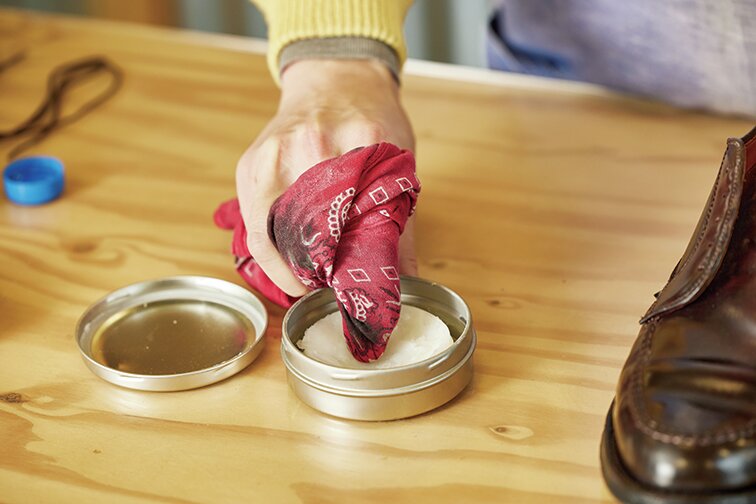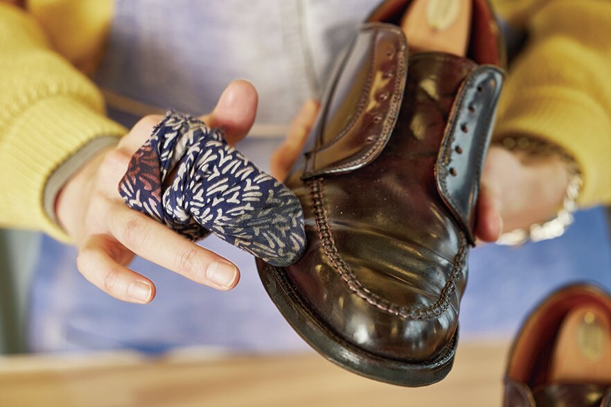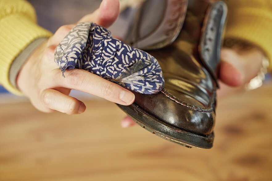 シワの入りやすい甲の部分を中心にクロスで全体に馴染ませていく。革を長持ちさせるためにも最も大切な工程。クリームは、本場フランスの「アナトミカ パリ」でも使用しているというオールデンのもの(本人私物)