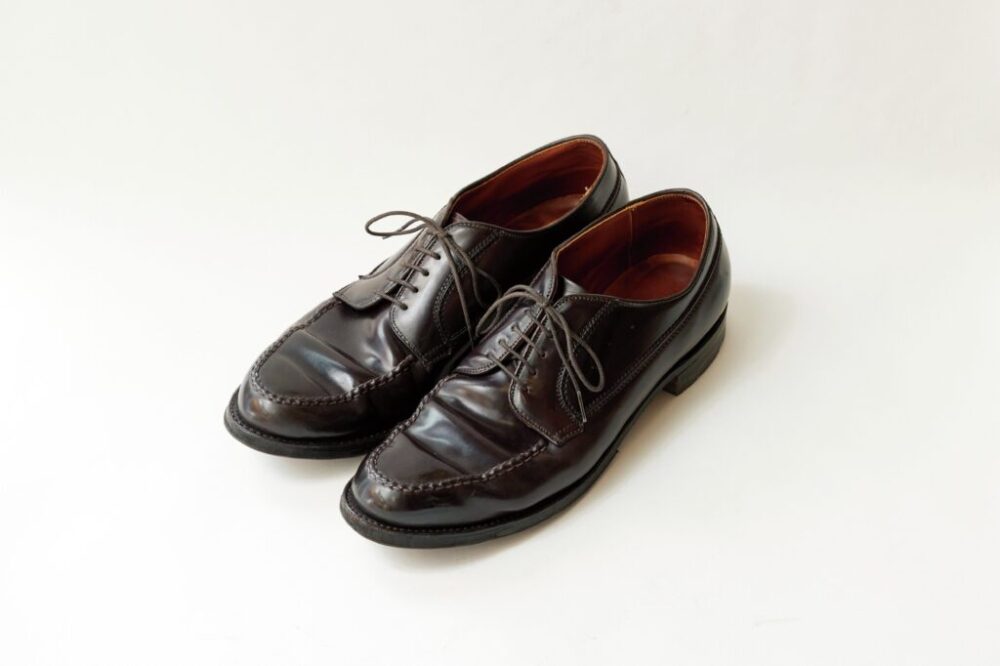 羽根部分もしっかりと磨くことができるようにシューレースを外し、革が張った状態にするためにシューツリーを入れる。その後、クリーナーなどを塗る時にその効果を半減させてしまうホコリを落とすために丁寧にブラッシング。