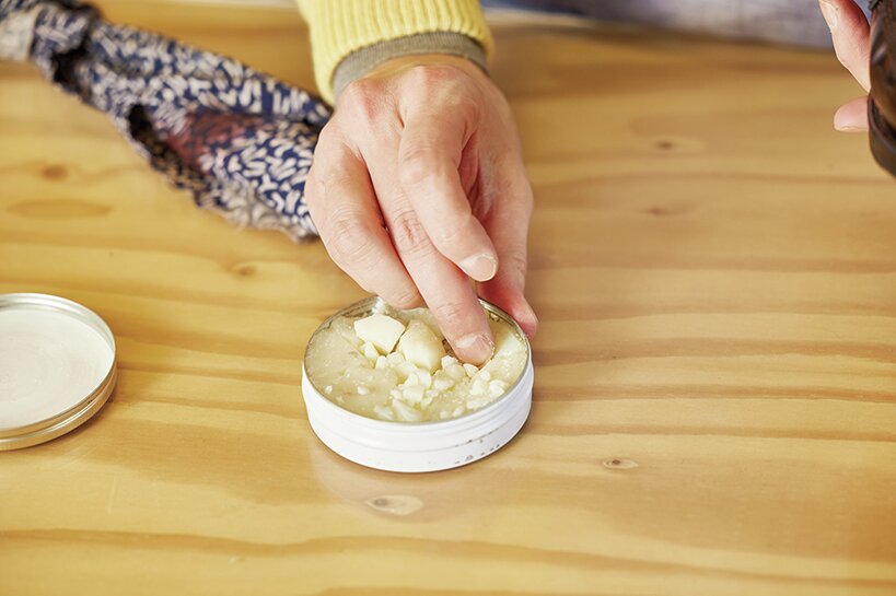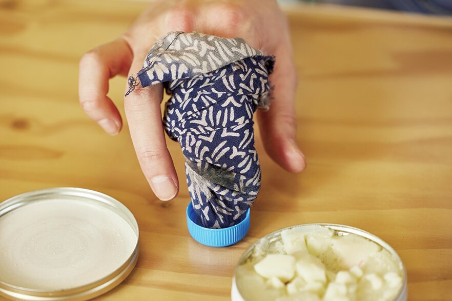 過去に塗ったワックスの層を溶かしながら除去する工程。クリーナーを適量クロス(手ぬぐい)に取り、円を描くように優しく塗る。革を傷めないように調合されている〈ブリフトアッシュ〉のクリーナーを使用(本人私物)。