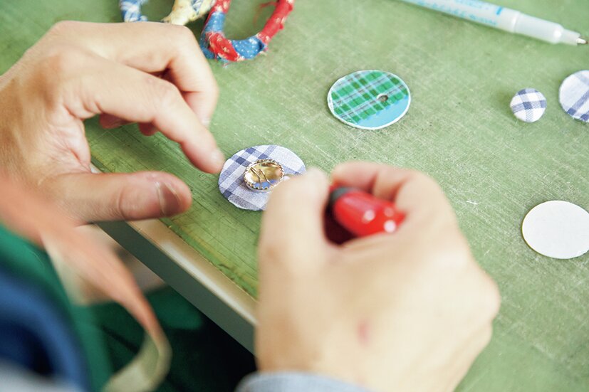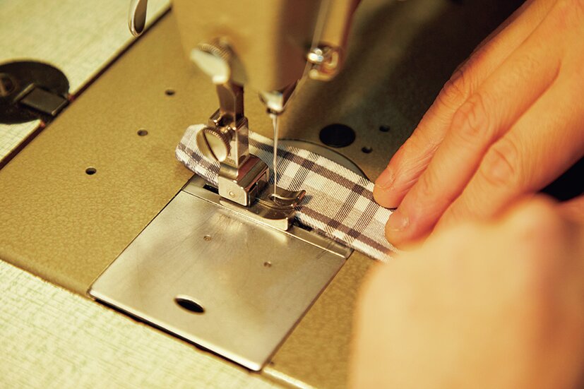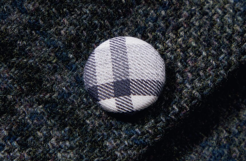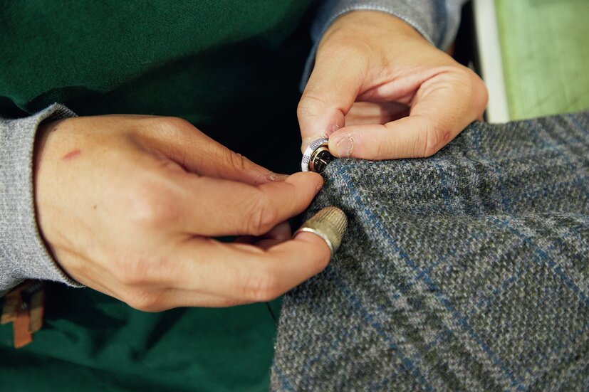 その後その切った生地を使ってジャケットにつけるチンストラップとくるみボタンを作っていく。ジャケットは肩パッドを外し、ナチュラルに。