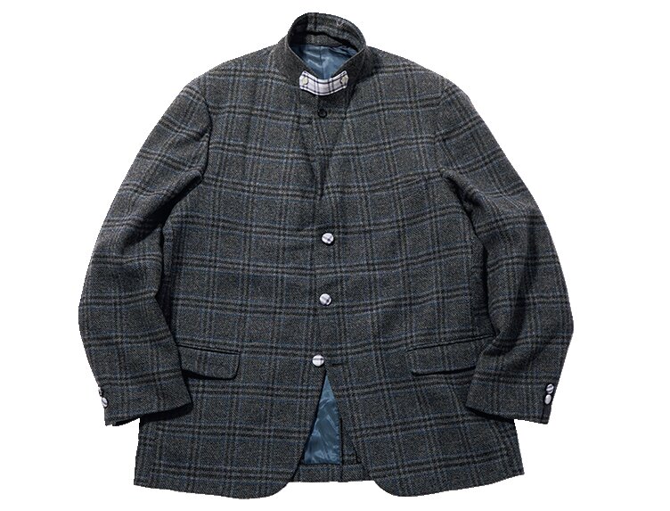 長袖シャツを5分丈に、切った生地を使ってジャケットにチンスト、くるみボタンに付け替え。旧いジャケットは着丈が長く、少し着づらいなんて意見もありますが、襟を立ててチンスト留めをしてハーフコートのように。
