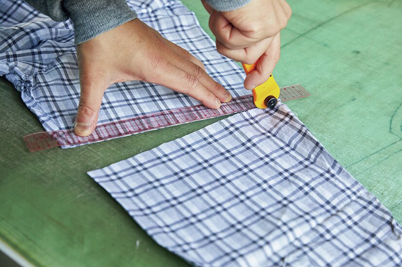 シャツのカフスを外し、袖を好みの長さに切っていく(縫い代などが必要なので数センチ長めに切っておく)。