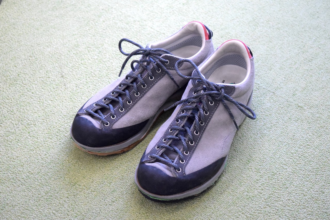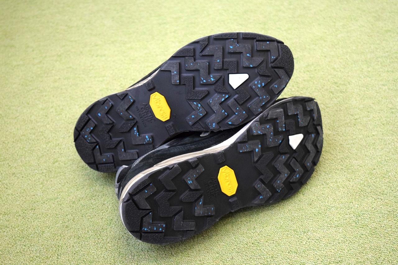 オーロラシューズには舗装された路面での歩行に特化した「XSシティ」をカスタム。乾いた路面での歩行のしやすさはもちろんのこと、雨の日の濡れた路面、地下鉄に向かう階段など街での滑りやすい舗装面でのグリップに特化したソールだ。山などのフィールドには履いていかない靴全てを張り替えたいほどにおすすめのソール。