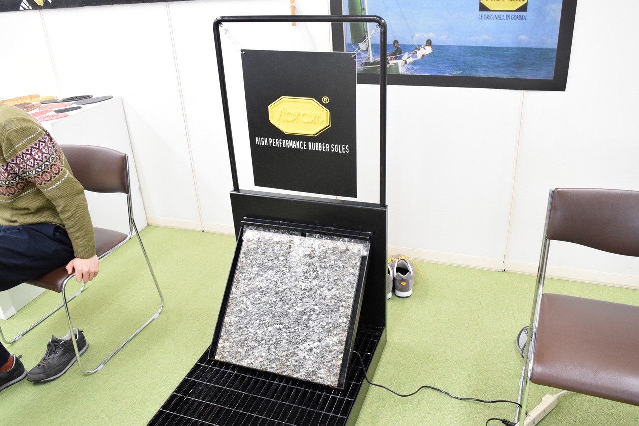用意されていたのは街でもよく見かける舗装された板が、約45度で設置され、その上を水が流れている、いかにも足を滑らせるための装置。なんと、この上に乗っても滑らないというヴィブラムソールを存在するというのだ。