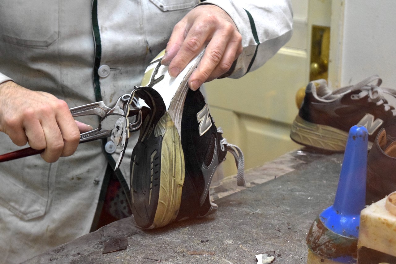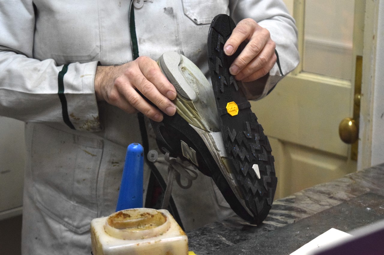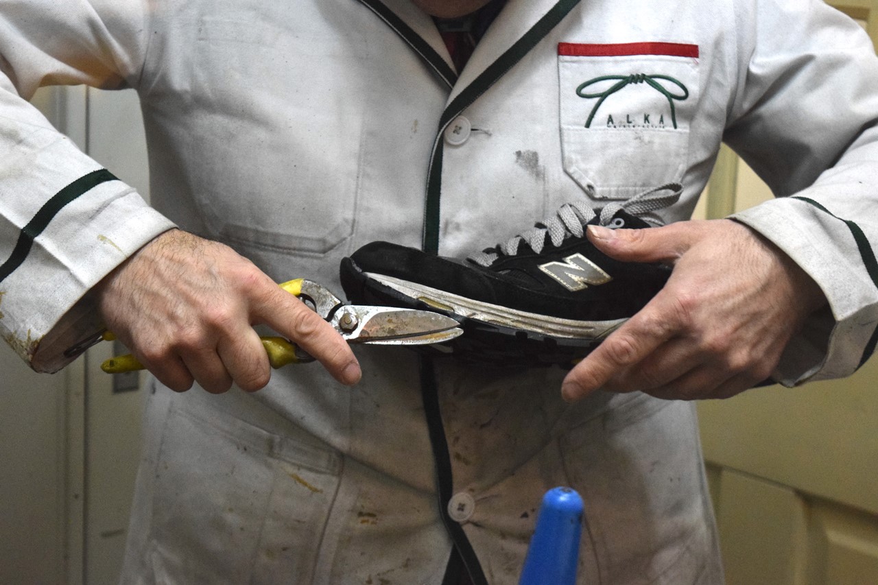 アルカには「シューキッチン」と呼ばれる工房が併設されている。そこでは、職人がお客様一人ひとりに合わせて靴の調整やカスタムを行っている。今回お願いをした靴3足もこの工房で、その場でカスタムをしてもらった。ソールを剥がし、新たなソールを接着していく。