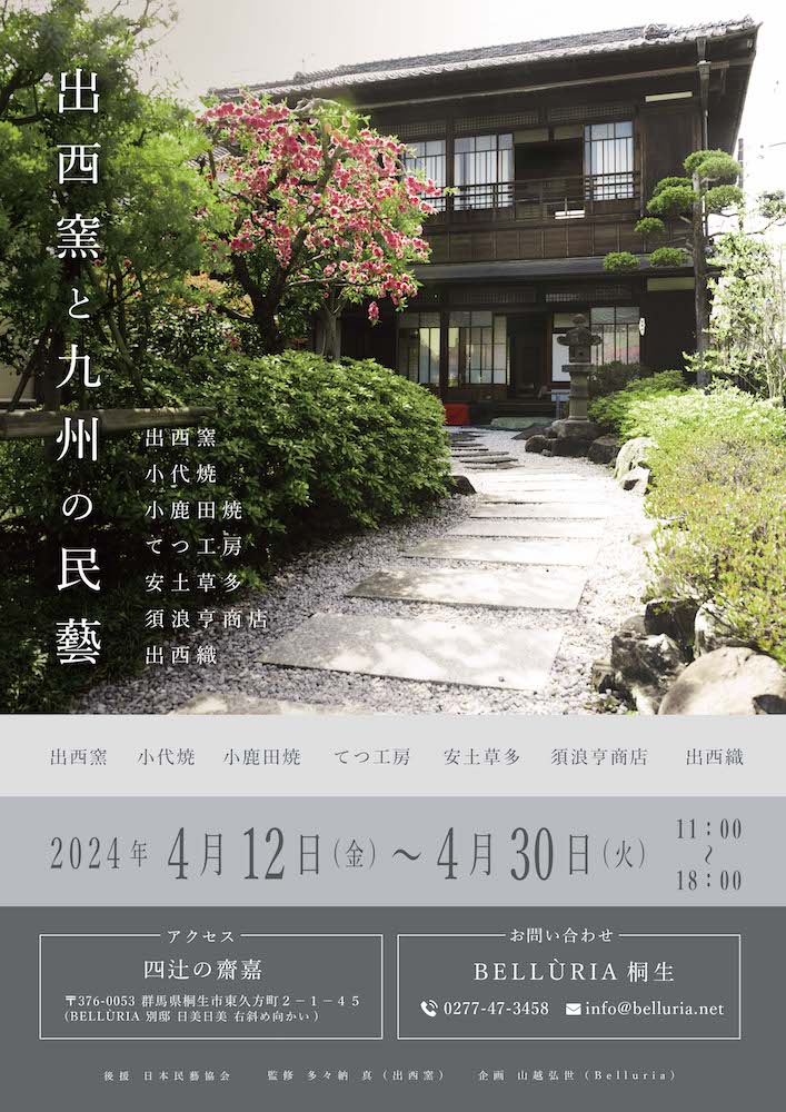 題して『出西窯と九州の民藝』。熊本・小代焼や大分・小鹿田焼など九州を代表する窯元から総数約3000点が出揃い展示される。会場は企画元のBELLÙRIA開業地の織都・桐生市にあるかつては織物の迎賓館として使われていた歴史的建造物、築101年の日本家屋にて開催される。