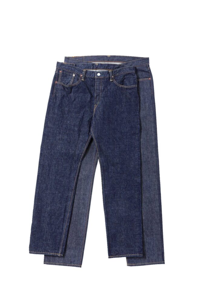 現代のジーンズでは一般的である防縮や捻れ防止の加工、毛焼きなどの最終仕上げを施すが、本作ではジーンズが誕生した当時の雰囲気を再現するため、未整理の生機デニムを採用。洗いをかけると右画像のように縮みが出るが、本作では縮んだ後のサイズ表記で販売するためご安心を。