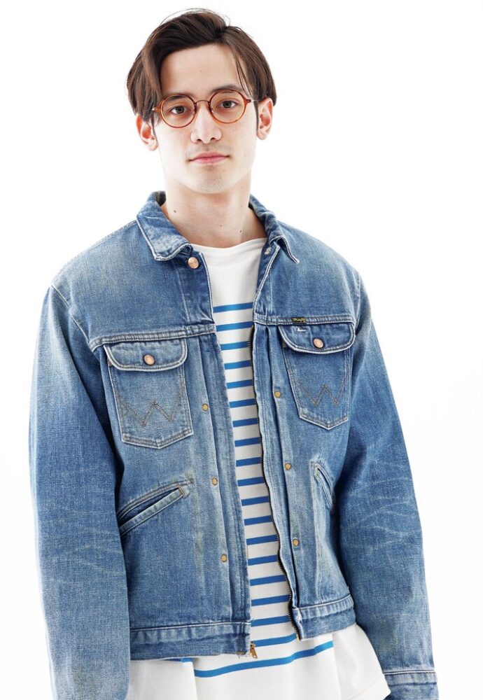 架空の人物が「ラングラー」を愛用していたら、をテーマに加工が施された[ウォーンアウト]のセットアップ。フランツ・ベルガーという架空のカメラマンをイメージしたアイテムは首から下げるカメラのアタリや、膝をつくために生まれる強いアタリを表現した。ジャケット3万1900円、パンツ2万6400円(エドウイン・カスタマーサービスTEL0120-008-503)