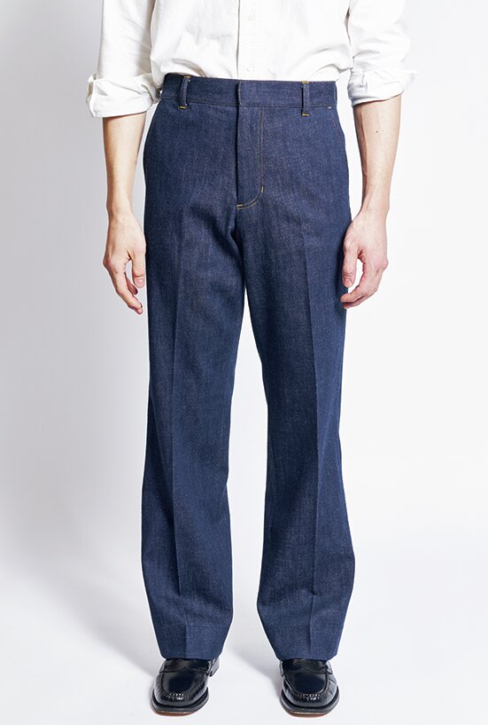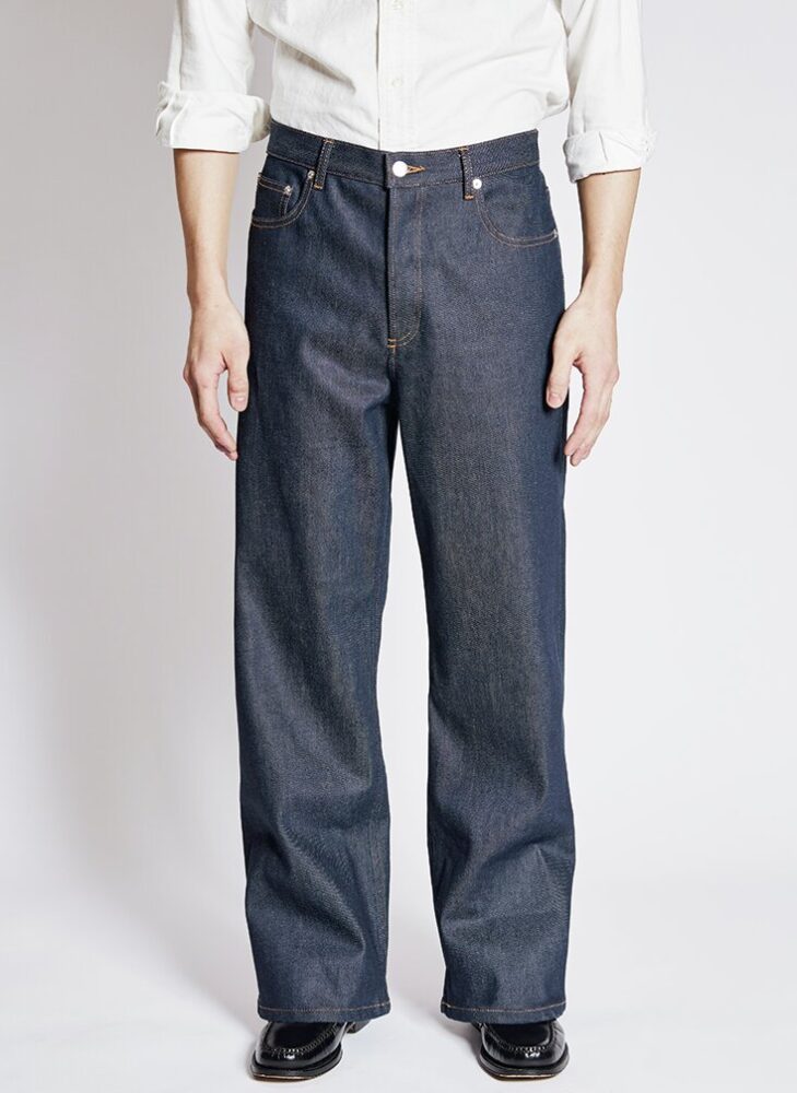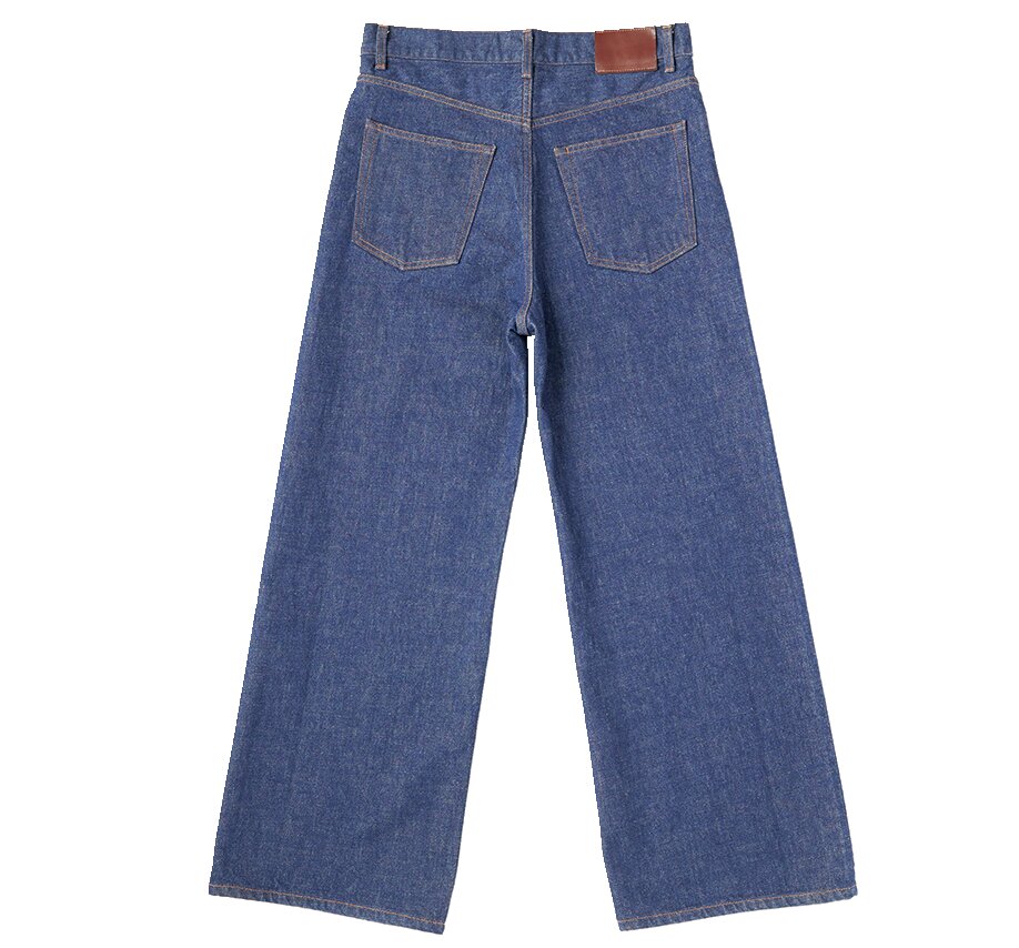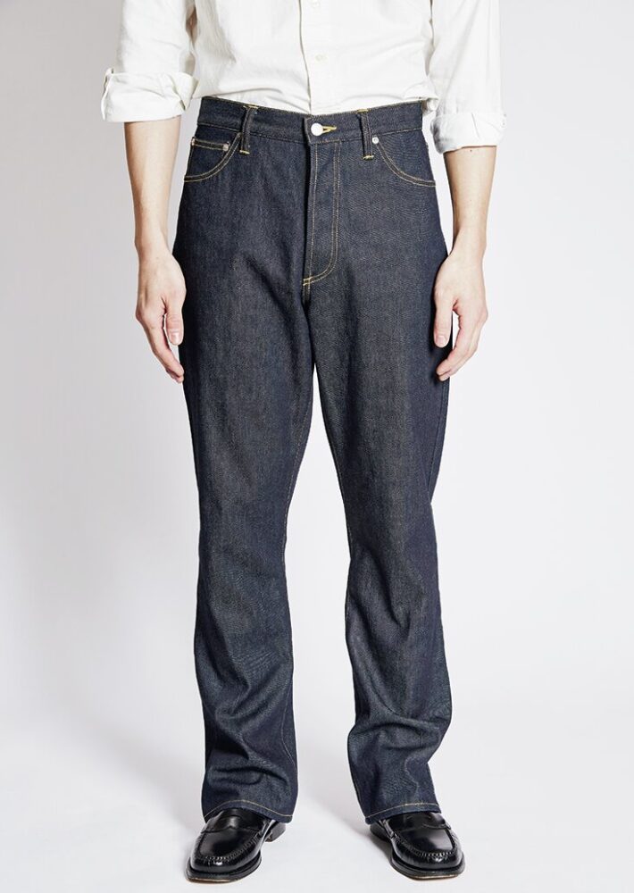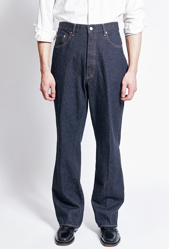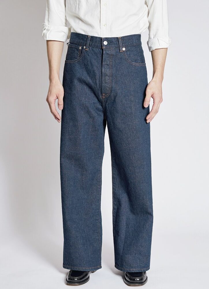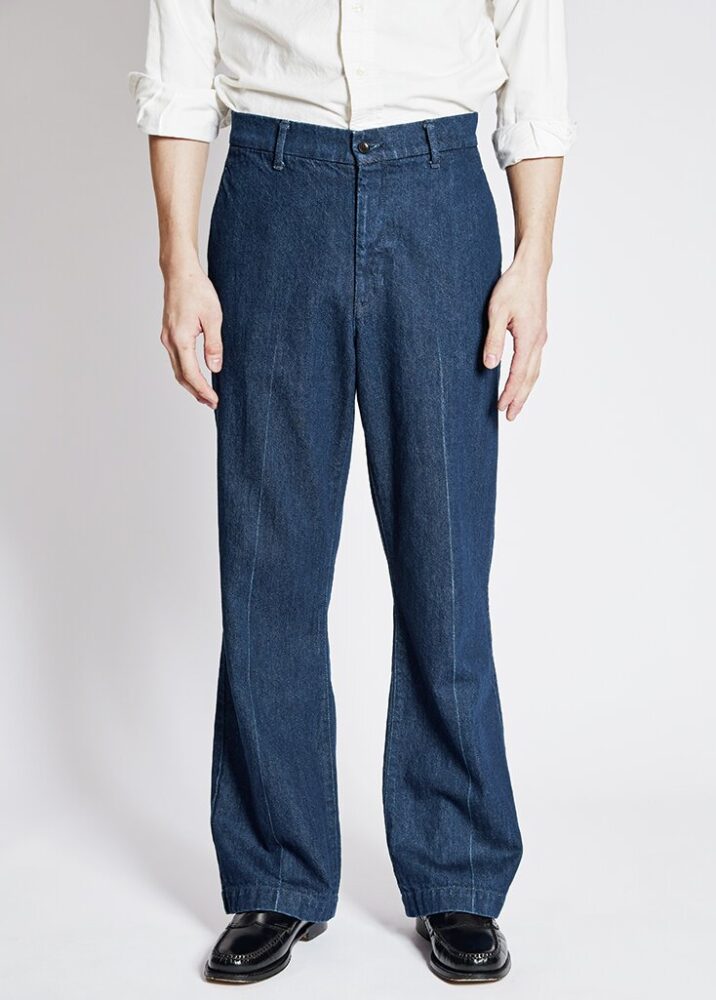旧式力織機でゆっくりと織られた12オンス生地が柔らかな穿き心地を実現。スラッシュポケットやセンタークリースなど、ドレスのディテールとバギー×フレアシルエットをミックスした。2万3650円(アークネッツTEL028-634-1212)