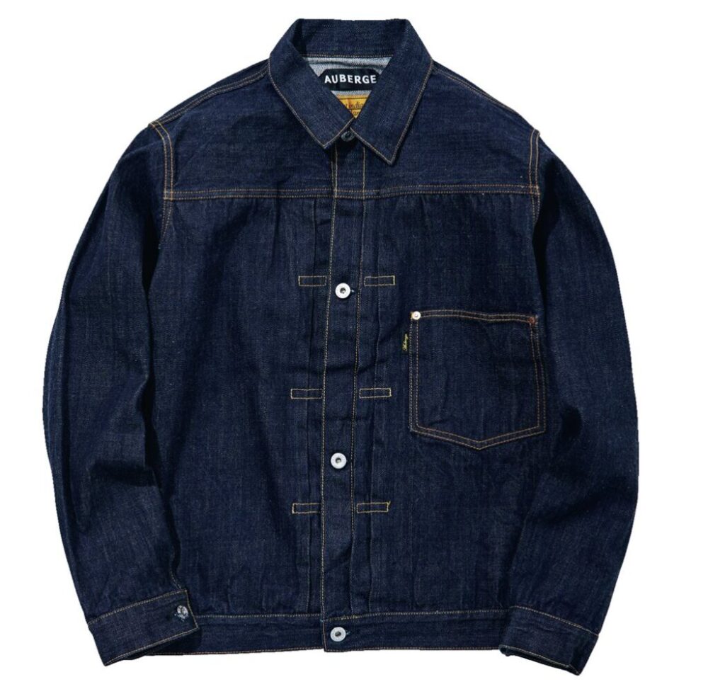 4つの糸番手を駆使した綿糸による飾りステッチ、鉄製のタックボタン、銅無垢製のリベットは、鈍く燻された質感へと変化する。型紙の妙でシルエットは現代的に洗練。8万4700円(スロウガンTEL03-3770-5931)