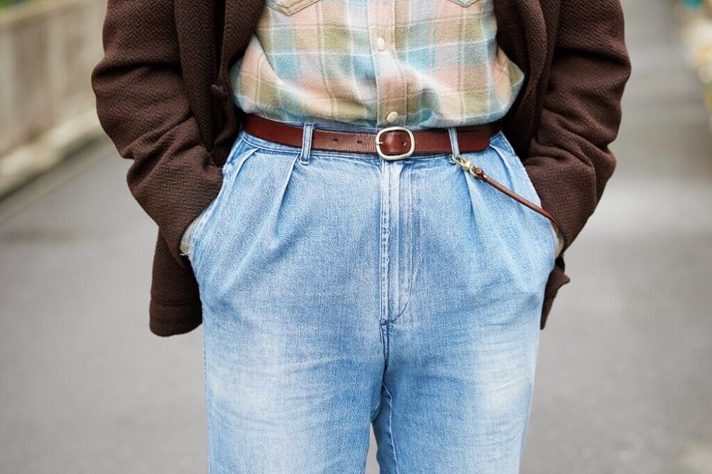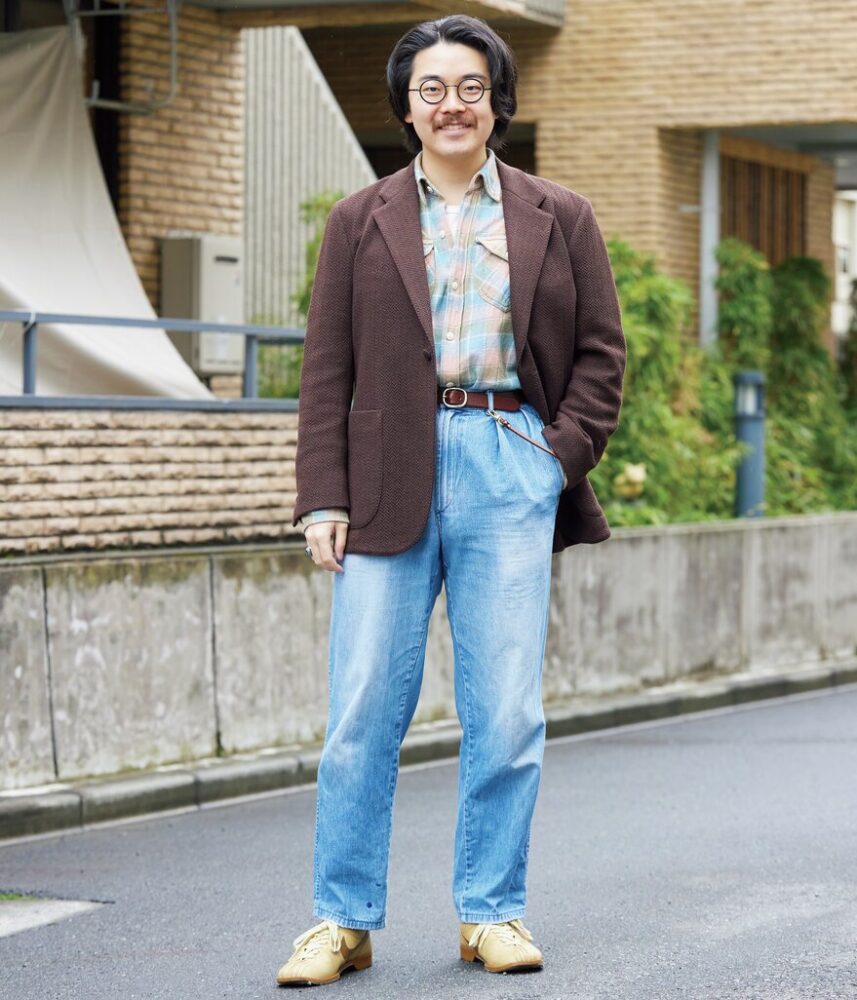 「観るのが2度目ということもあり衣装に注目していると、主人公が『クラークス』にチノパンを穿いていたり、アルバカーキという土地柄もあって全体的に茶系の色味の多いどんよりした雰囲気。その中でたまにデニムを穿いている登場人物が出てくるとすごく映えるんです。そこからブルーとブラウンの合わせっていいなと感じてカジュアルなブラウンジャケットを合わせました。デニムのトラウザーズなのでジャケットとの相性は言わずもがなです」