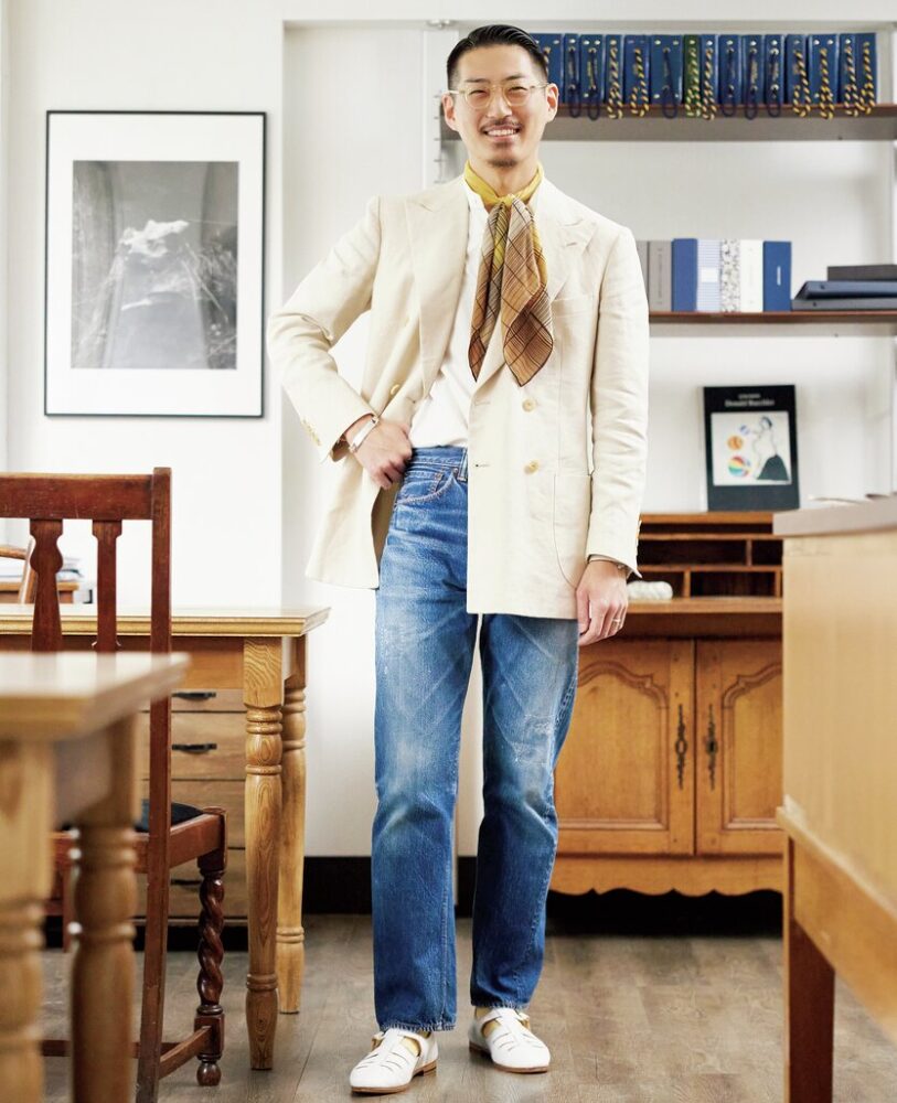 「19歳くらいの時に『自分で色落ちさせたい!』と思って購入し、毎日穿き続けるいわゆる“根性穿き”もしていました。良くも悪くもアメカジ色の強いアイテムですが、股上が深いものを選び、小物や靴でバランスを取ることが、ドレスとデニムのミックスするコツかもしれません」