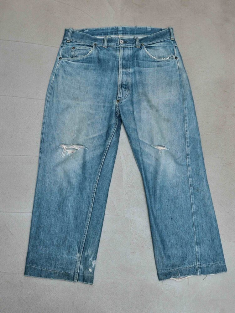 ズドンと落ちるやや太めのシルエットと両膝に入ったダメージが特徴的な40年代のヴィンテージ。むき出しのリベットや綿糸のステッチ、絶妙な色落ち具合など、ヴィンテージデニムらしい魅力が詰まっている。