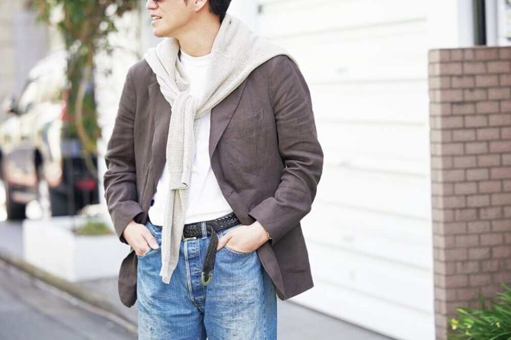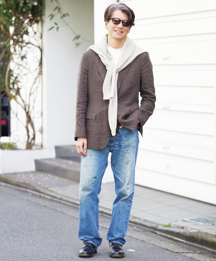 「デニムパンツにジャケットのスタイルには、ずっと憧れがあるんですよね」と若い頃に見た大人たちへの憧れを話す坂田さん。