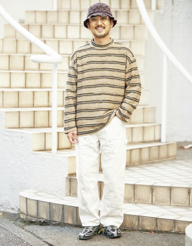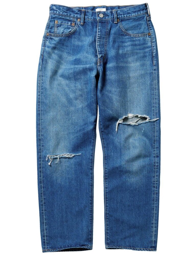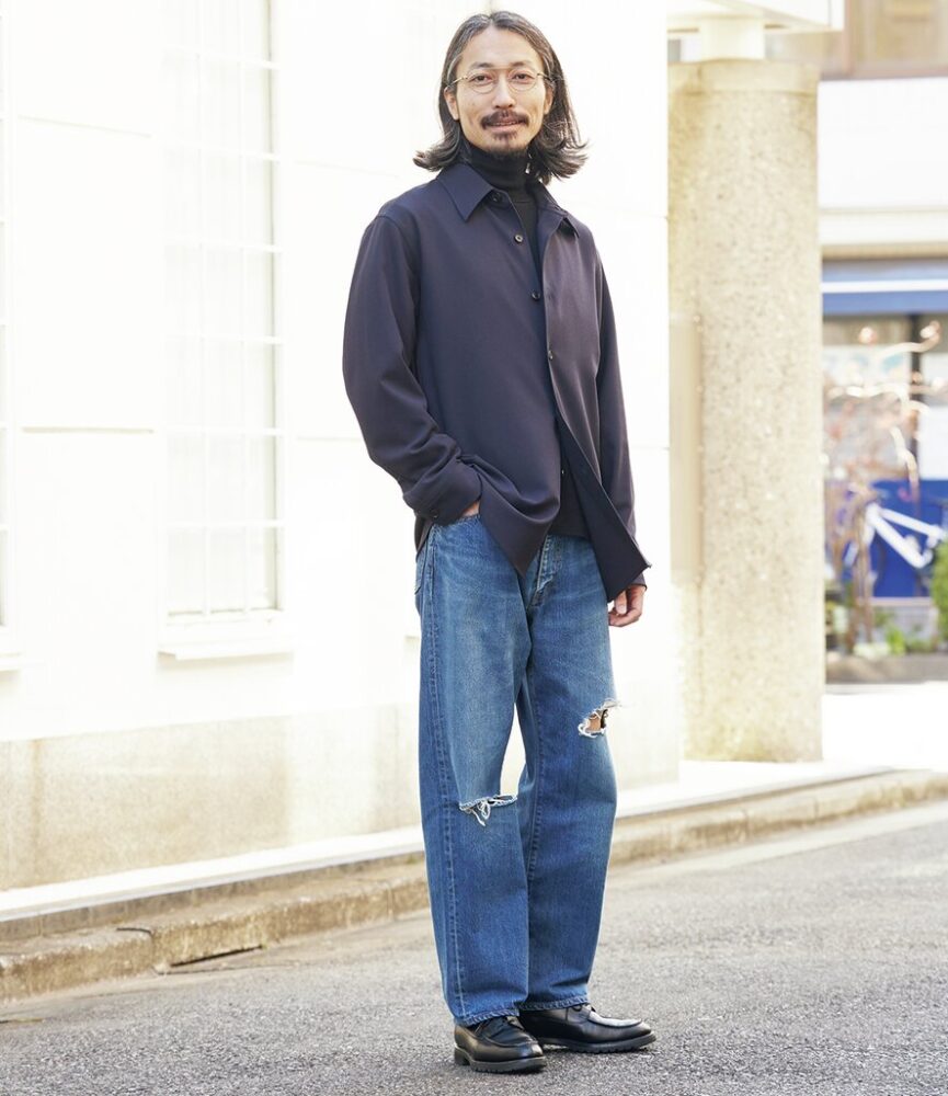 「アメリカのヴィンテージデニムを独自に解釈した日本のデニムらしい加工や膝が出ない位置に入ったダメージが嫌らしくなくて好みです。カジュアルになりすぎないのでクリーンなスタイルにもよく合いますし、自然なヒゲなどヴィンテージライクな風合いも魅力です」