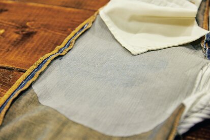 ポケットや膝の破れ、股の裂けなど、細かいダメージの補修に絶大な自信を持つ同店。一時的な補修にとどまらず、この先に入りうるダメージ(=二次災害)を防ぐために接着芯を大きめに貼っているのもポイントだ。