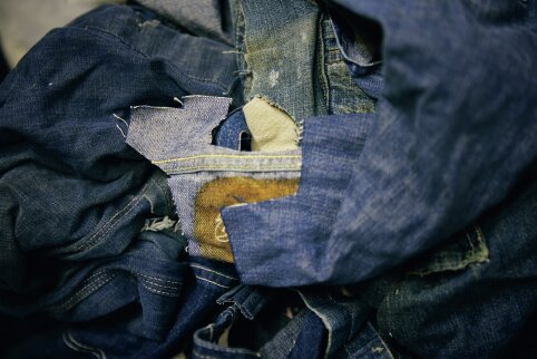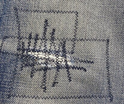 穴が空いたデニムに異なるデニム生地を貼って補修することでデザインとして昇華する。